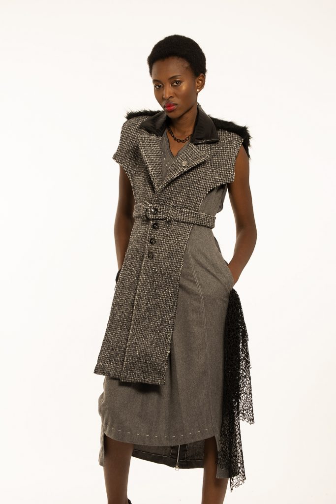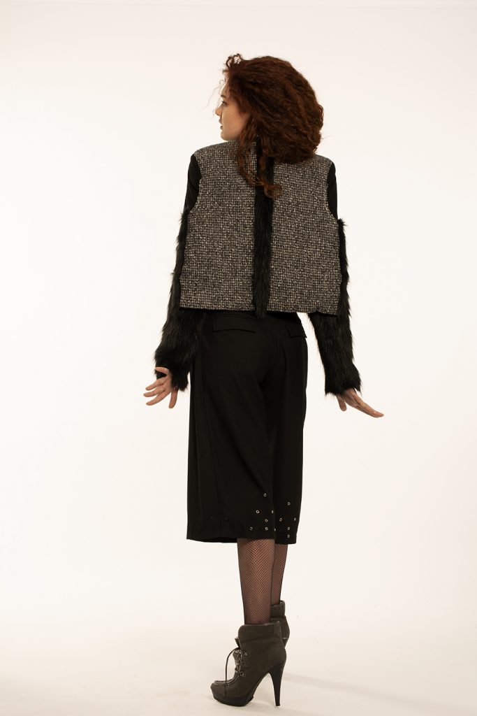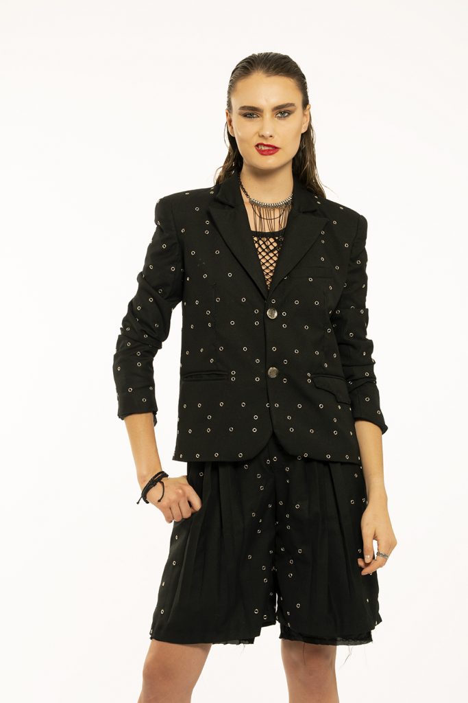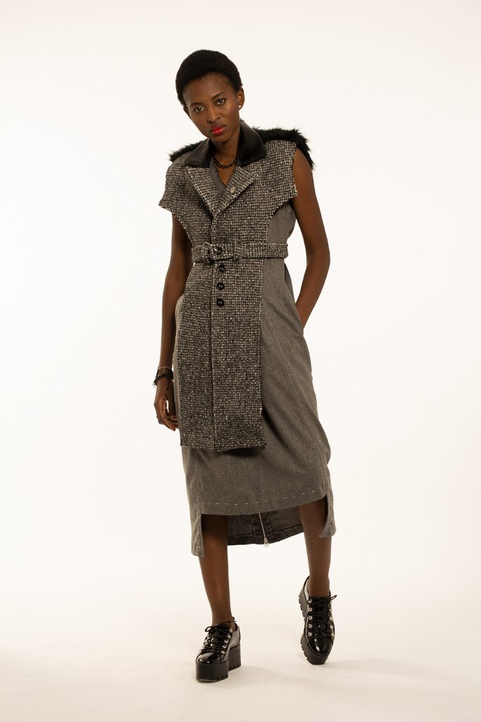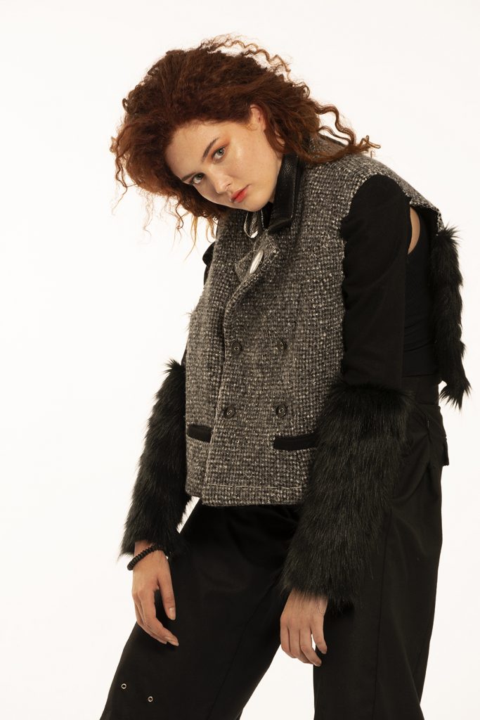 My collection was inspired by punk principles because I personally relate to the diverse array of ideologies, fashion and other forms of expression the punk subculture has to offer. I grew up around gang violence and hatred which had a huge impact on my life. I always tried to see the positive side in every cynical situation and that is what I tried to do with my collection. Modern design that honours the past. My designs consist of a look and feel which touch the segmentation of a male characteristic and can be identified as being boyish but can be worn as a uniform. The range has a rebellious formality to the aesthetic of my designs which I think can be depicted as a distorted reference to punks. The cohesiveness that is illustrated within the range, highlights classic silhouettes and working/decorative elements such as inverted pleats, lapel collars, welt pockets, exposed darts and hand topstitching. Hardware is also a key element in the range because it features metal eyelets, buttons and accessories such as earrings, bracelets, belts as well as rings. The practical suitability of my proposed fabrics consists of wools, faux fur, polyester and cotton which is recycled and deconstructed in order to live and meet the needs of humans as well as other species without compromising the ability of future generations to meet our own needs. Therefore organizing society so that it can exist in the long term. This means taking into account both the imperatives present and those of the future, such as the preservation of the environment and natural resources or social and economic equity.