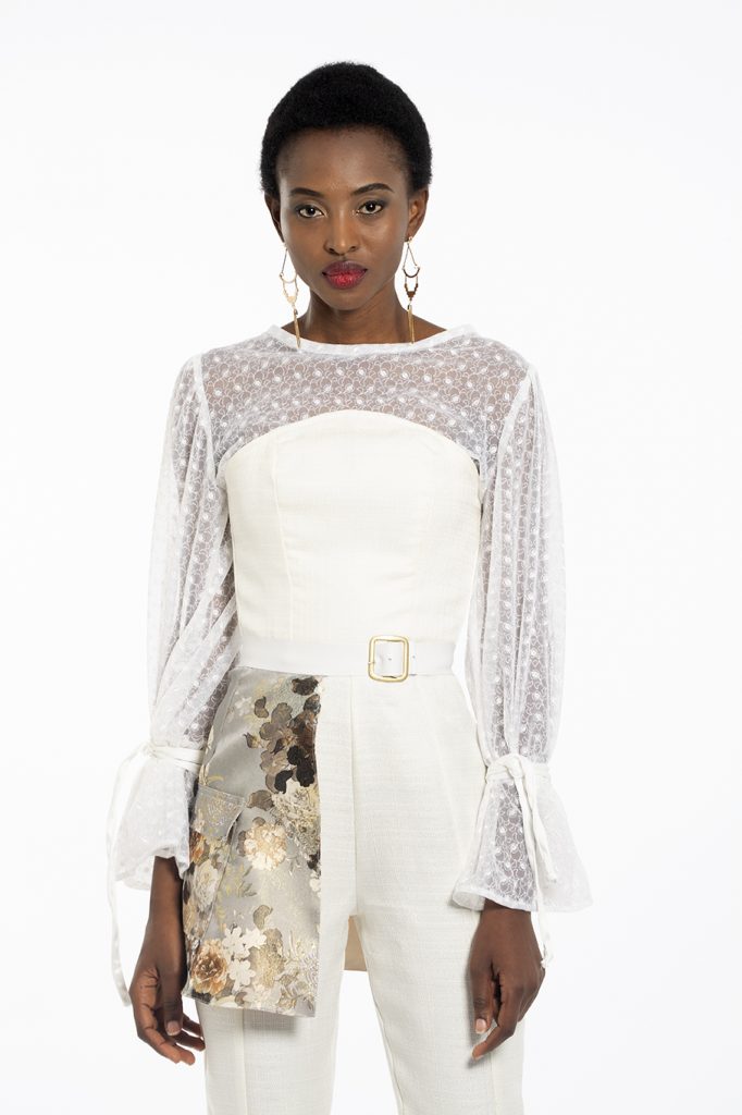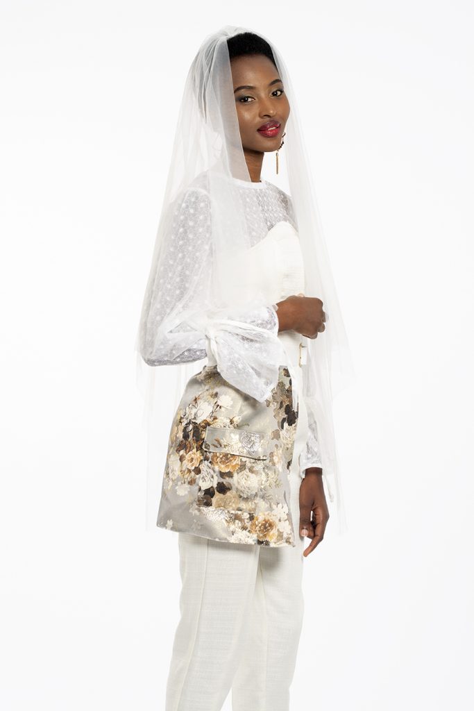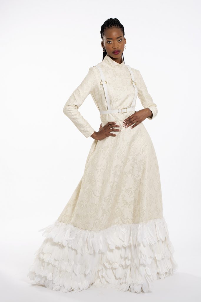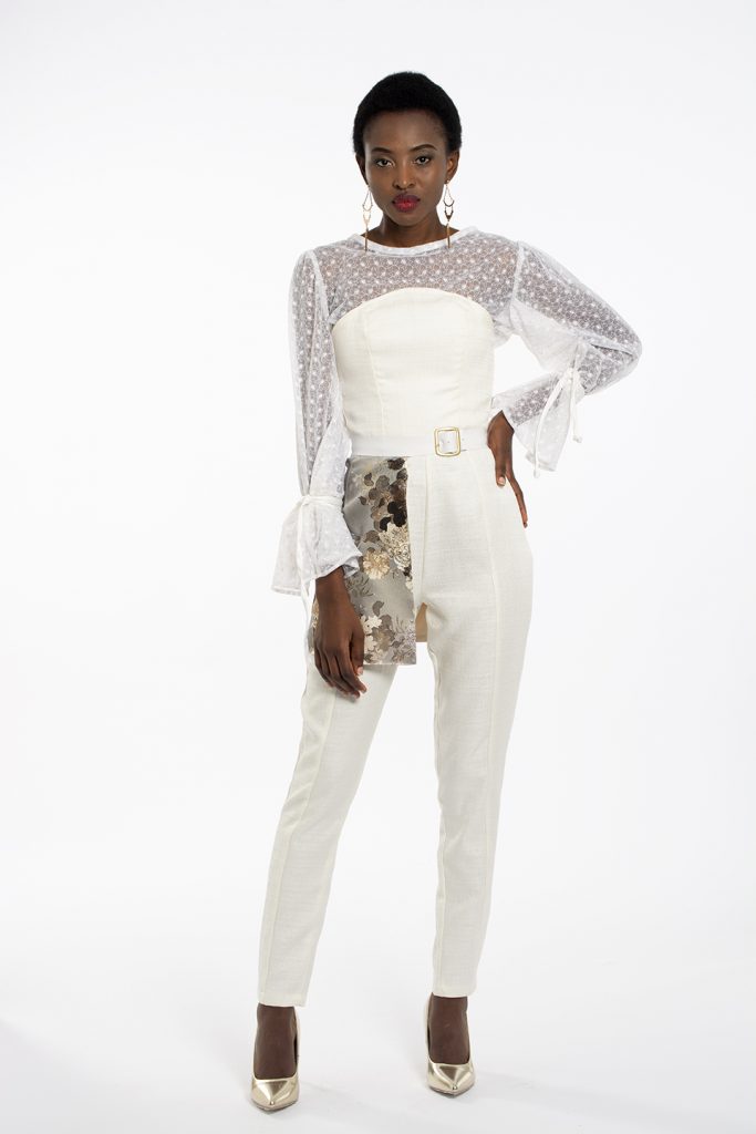 My collection is a bridal collection, designed to go against the stereotypical construct of what a bride should wear on her big day. The collection consists of one off-white, A-line dress with a feathered train    for those brides who would still like to go semi-traditional. The rest of the collection goes the unconventional route, for the brides whom want to go against the norms, including a tailored suit and blouse, a jumpsuit and blouse and a skirt and blouse. The designs and fabric choices are inspired by the stately soiree trend, including rich fabrics to create an opulent look and feel.