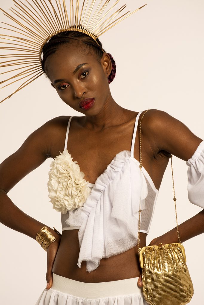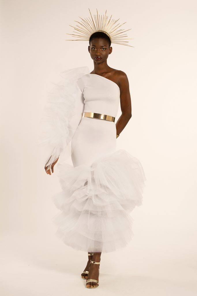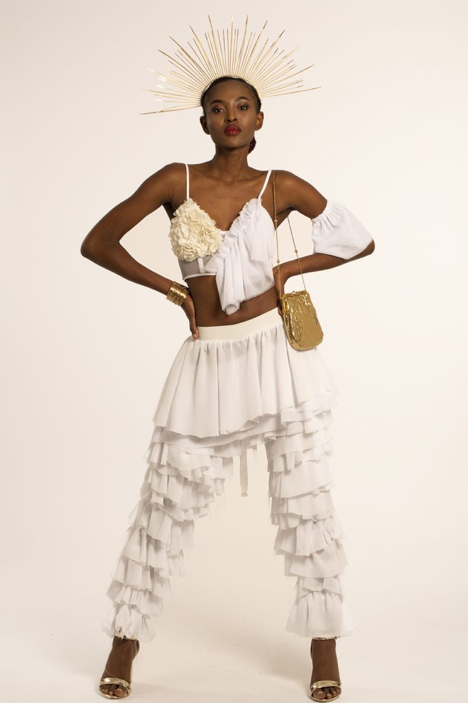 Calm and soft are the keywords that describe me best. The softness of the fabrics and colour choice of my range depicts my personality. I expressed the big heart I have for people on the big, full silhouettes that creates a glamorous look which is my intended design aesthetic. This aesthetic also focuses on decorative details like frills, ruffles and flowers. My passion for couture is what attracted me to ‘Joyful Camp’, the big, voluminous silhouettes. This range has few exaggerated shapes, most garments are asymmetrical cuts, very clean colour palette and flowy apparels. The entire collection screams ffeministic occassionwear completed by clean, gold accessories.